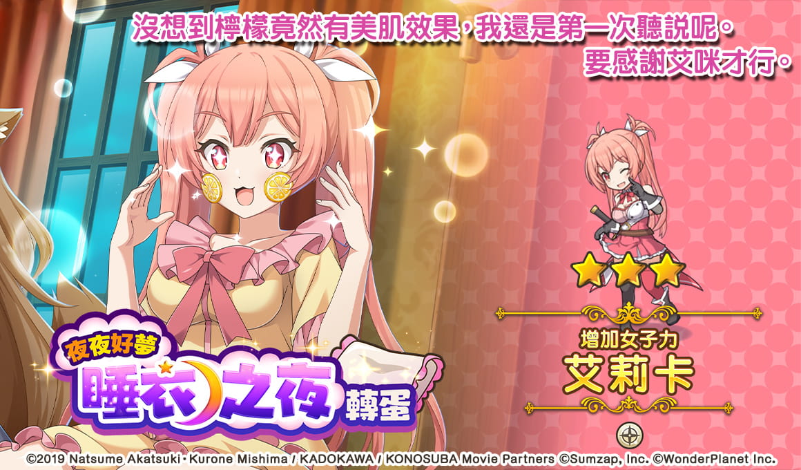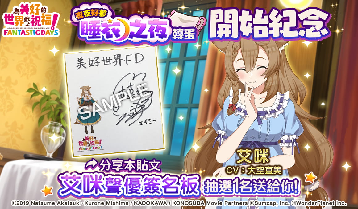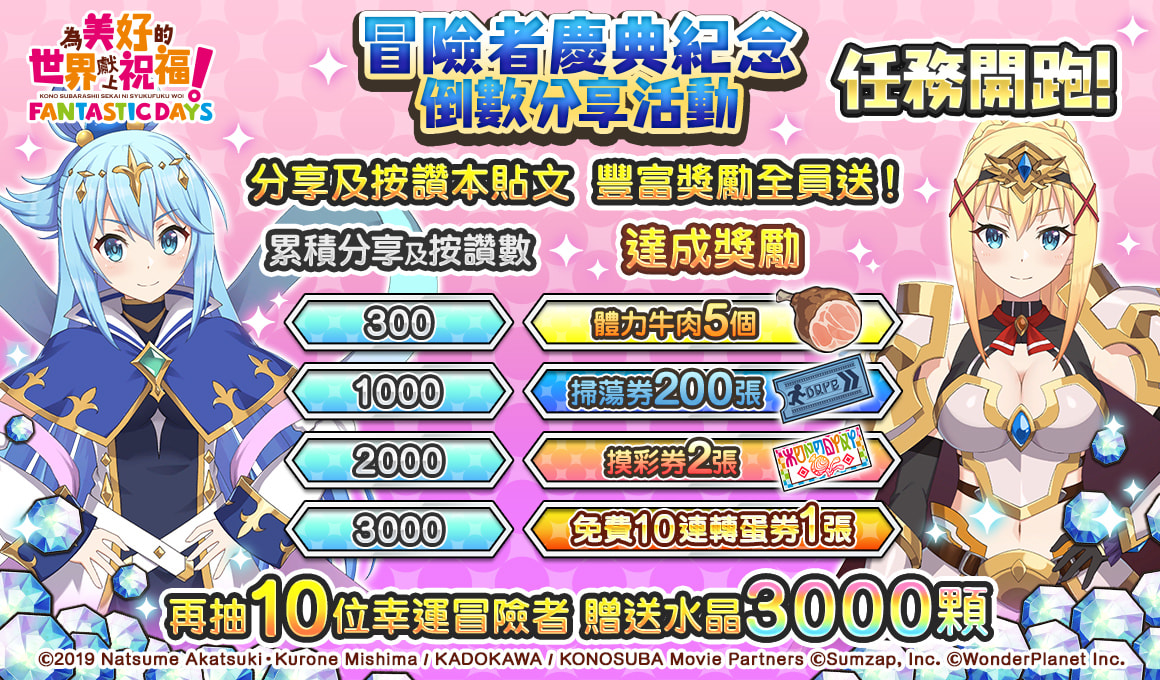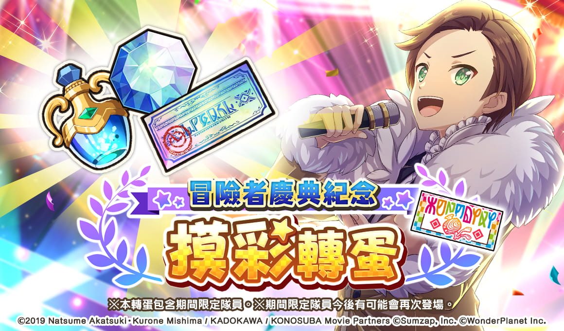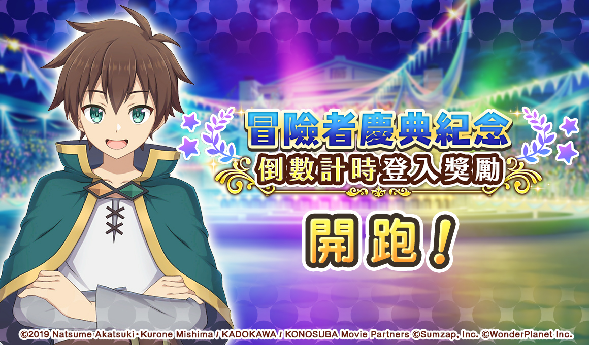 致力發展數位娛樂服務的 WonderPlanet Inc. (總公司:名古屋市,CEO:常川友樹,以下簡稱「本公司」) ,由本公司發行及營運,改編自人氣動畫《為美好的世界獻上祝福!》首款手機遊戲《為美好的世界獻上祝福!Fantastic Days》(以下簡稱《美好世界FD》) ,將於2021年5月21日(五) 起舉辦「冒險者慶典紀念活動前夜祭」,特此告知。